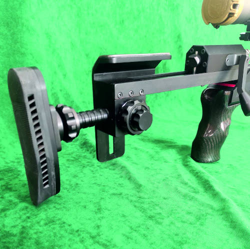 The stock folding feature allows for quick folding of the stock using a latch, without the need for tools. Both the height and angle of the stock can be adjusted tool-free. The length of the stock also can be adjusted without the use of tools. The cheek rest can be adjusted laterally and vertically, also without the need for tools. It provides an ergonomic carbon fiber grip.